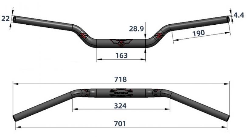 Руль SPIRIT BEAST с переменным сечением 22-28 мм. Длина 715 мм, подъем 110 мм, толщина стенки трубы 4 мм. |
