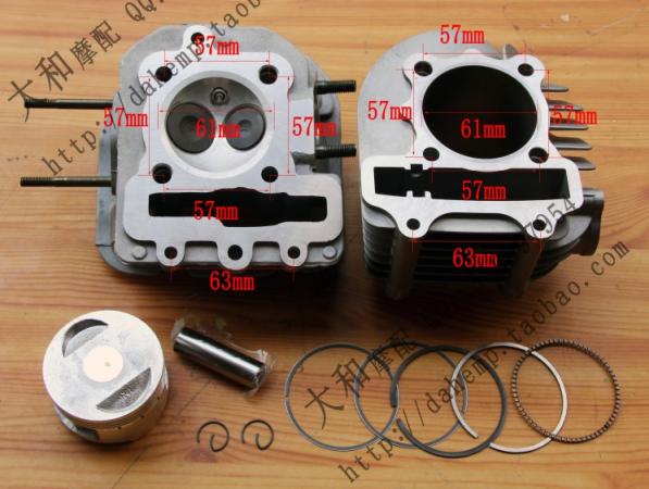 Комплект цилиндро-поршневой группы для двигателя с отличными от большинства версий GY6 посадочными местами и отверстиями. Расстояние между шпильками - 57 мм.