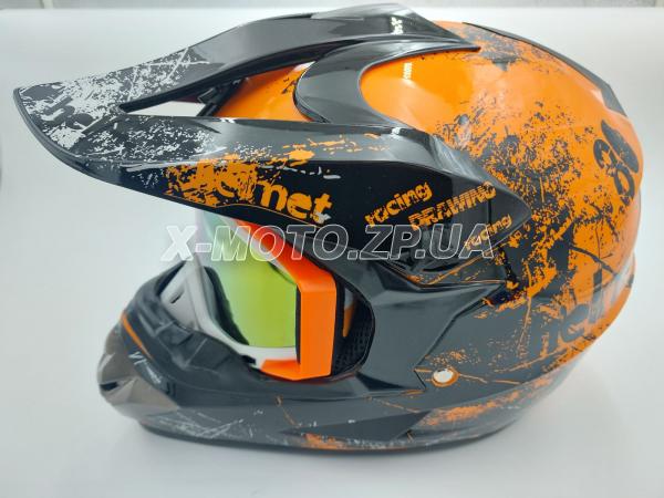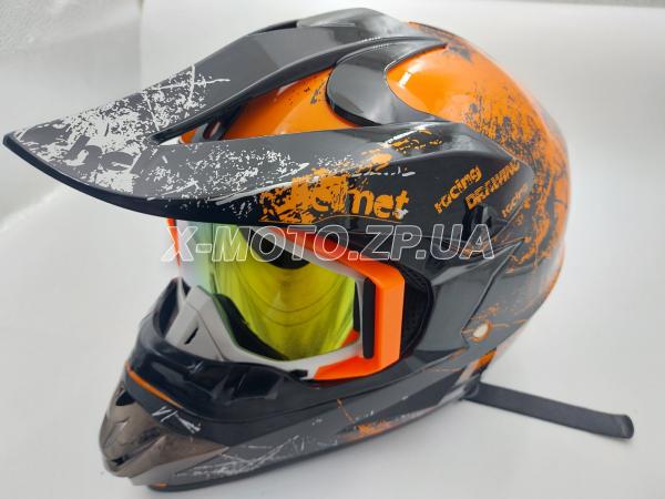 \ Шлем кроссовый OFF ROAD в комплекте с очками черно/оранжевый глянец р.М