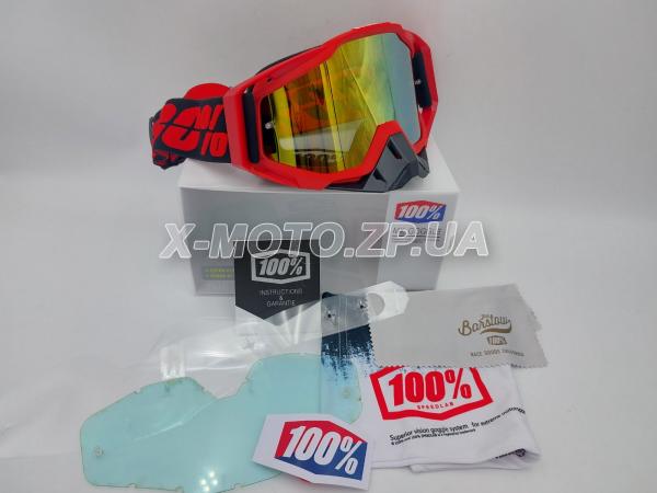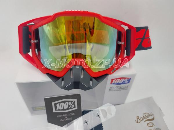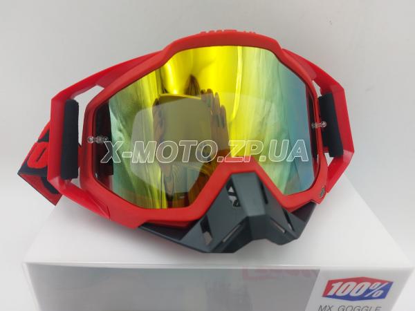 Очки (маска) кроссовые-эндуро 100% красно-чёрные с зеркальной линзой желтого цвета, с защитой носа черного цвета