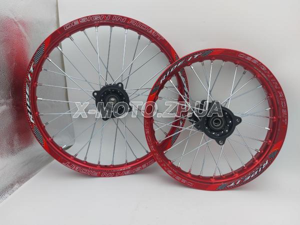 Комплект: Диск передний, легкосплавный 1,6*17 (70/100-17) и диск задний, легкосплавный 1,85*14 (90/100-14) "RIDE IT"красный. Материал алюминий, покрытие анод. Комплектация: обод, спицы, ступица. Ось 12 мм. Подшипник 6301 RS. Kayo/Viper/Geon X-pit X-ride/YCF/Apollo/BSE