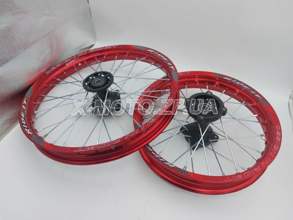 Комплект: Диск передний, легкосплавный 1,6*17 (70/100-17) и диск задний, легкосплавный 1,85*14 (90/100-14) "RIDE IT"красный. Материал алюминий, покрытие анод. Комплектация: обод, спицы, ступица. Ось 12 мм. Подшипник 6301 RS. Kayo/Viper/Geon X-pit X-ride/YCF/Apollo/BSE