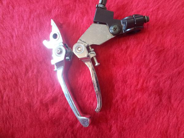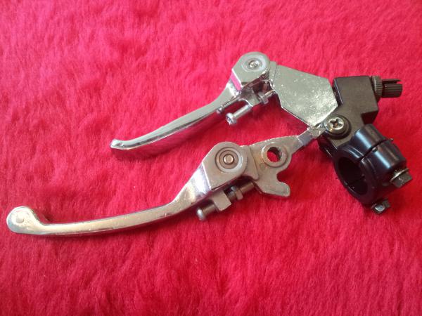 Рычаги тормоза и сцепления широкие, складные. Складываются при падении. Покрытие хром. Утолщенные курки. Цена комплекта ( левый+правый+крепление ) - 435 грн. Цена левая ( сцепление ) ручка+крепление - 270 грн. Цена правая ( тормоза ) ручка - 165 грн. А так же можно купить тюнинговые ручки CNC тормоза и сцепления для питбайков. |