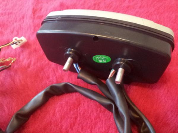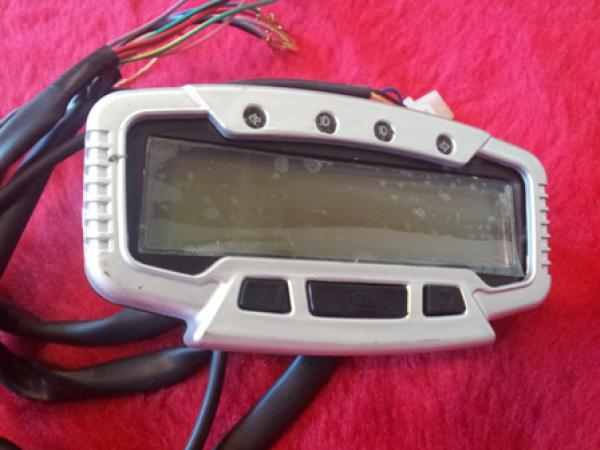 Приборная панель Geon. Крепления в комплекте. Спидометр работает по принципу вело компьютера ( магнит на колесе, и датчик на вилке ). А также тахометр, указатели поворотов, свет дальн/ближний. Цвет - серебро. Размеры: длина 13,5 см, ширина 7 см, высота 3,8 см.